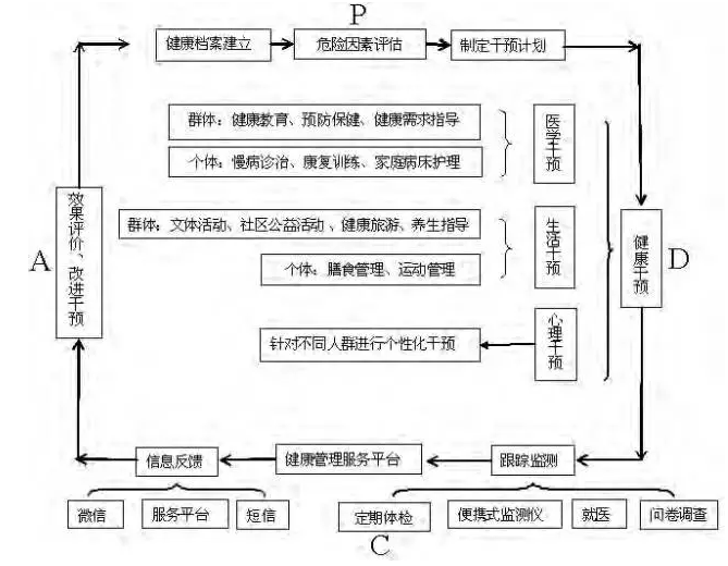 鮑勇將社區(qū)健康管理定義為: 對(duì)社區(qū)健康人群、疾病人群的健康危險(xiǎn)因素進(jìn)行全面監(jiān)測(cè)、分析、評(píng)估、預(yù)測(cè)、預(yù)防,維護(hù)和發(fā)展個(gè)人和家庭技能的全過(guò)程。