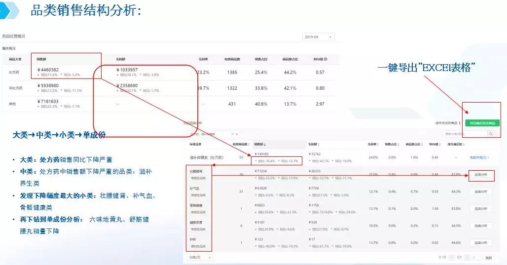 得出分析結(jié)果,提升方案就唾手可得了嗎?并不!確定了核心增長(zhǎng)品類(lèi)之后,需從整體到大類(lèi)、中類(lèi)、小類(lèi)、單成分單品進(jìn)行抽絲剝繭,基于多維逐層分析,最后才能精準(zhǔn)地制定出提升方案。