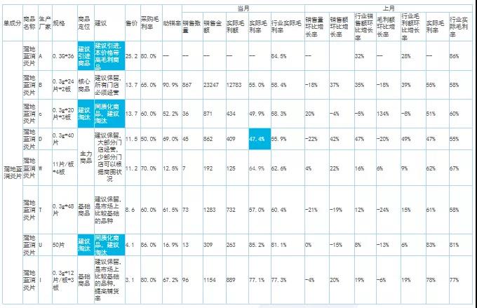 大類(lèi)分析主要看整體銷(xiāo)售結(jié)構(gòu),找出核心大類(lèi)的增長(zhǎng)機(jī)會(huì)點(diǎn)。例如,這組數(shù)據(jù)中不管是整體毛利率還是銷(xiāo)售額增長(zhǎng)率,都低于行業(yè)均值。細(xì)分處方藥、非處方藥及中藥等品類(lèi)的情況可以看出,處方藥的同環(huán)比銷(xiāo)售額以及銷(xiāo)售占比均低于行業(yè)值,而毛利率卻高于行業(yè)值?梢缘贸觯瓿踔贫ㄌ幏剿帪楹诵脑鲩L(zhǎng)大類(lèi)的策略沒(méi)有落地。所以,接下來(lái)做中類(lèi)、小類(lèi)跟單成分分析的時(shí)候需要進(jìn)行針對(duì)性監(jiān)控。